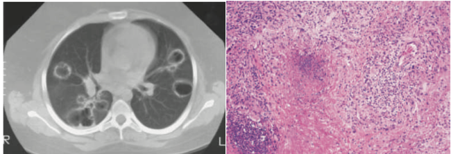 폐: 다발성, 양측성 공동성 결절(cavitary nodules), 객혈