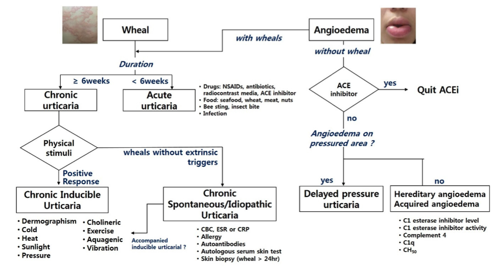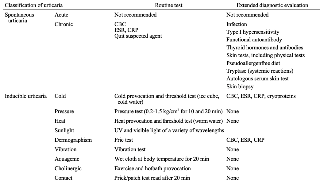 만성 자발성 두드러기: 혈액검사 (CBC, ESR, CRP, 간기능 검사 등) 감염, TFT 및 자가항체, ASST (자가혈청 피부반응검사) 등