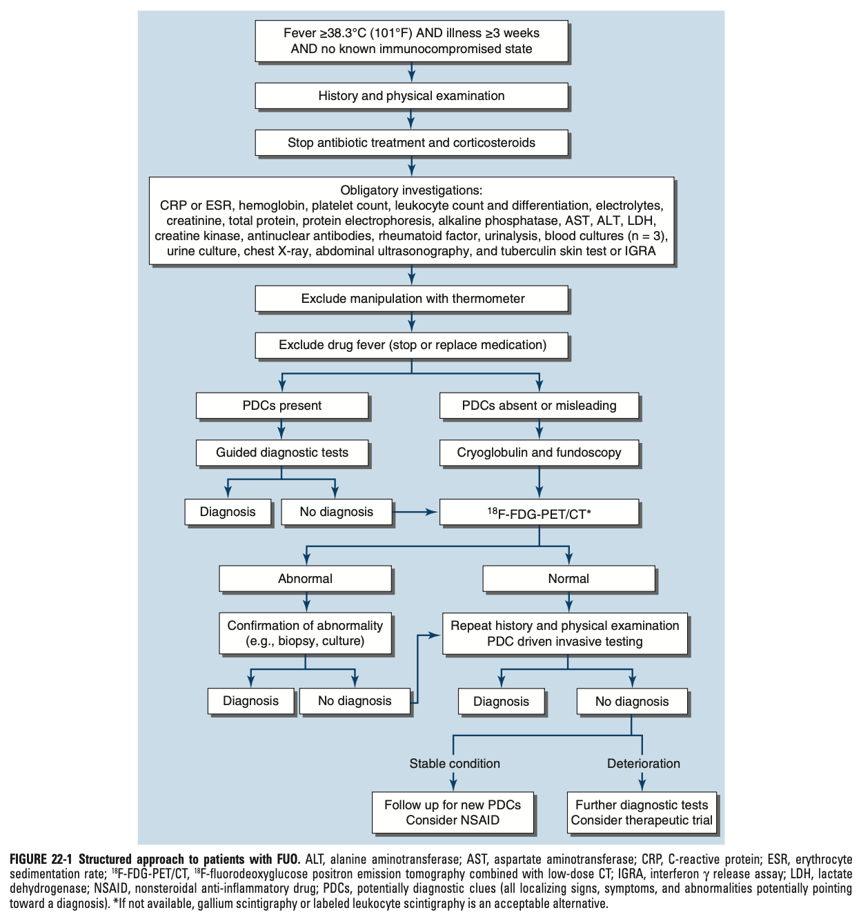 2단계: 18F-FDG-PET/CT 시행 (불가 시 갈륨 스캔 또는 백혈구 스캔 대체)