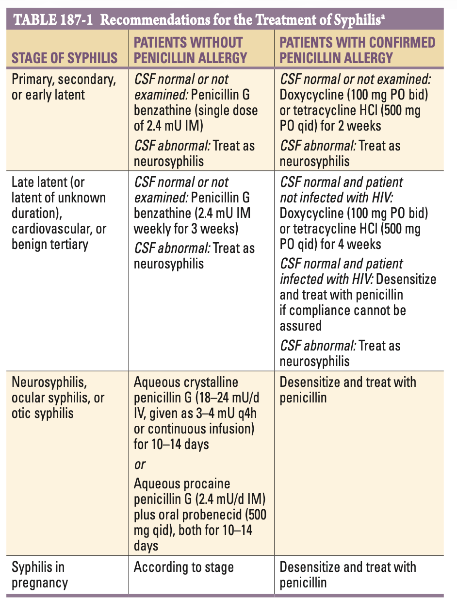 1기, 2기, 조기 잠복: Benzathine penicillin G 240만 단위 IM, 1회