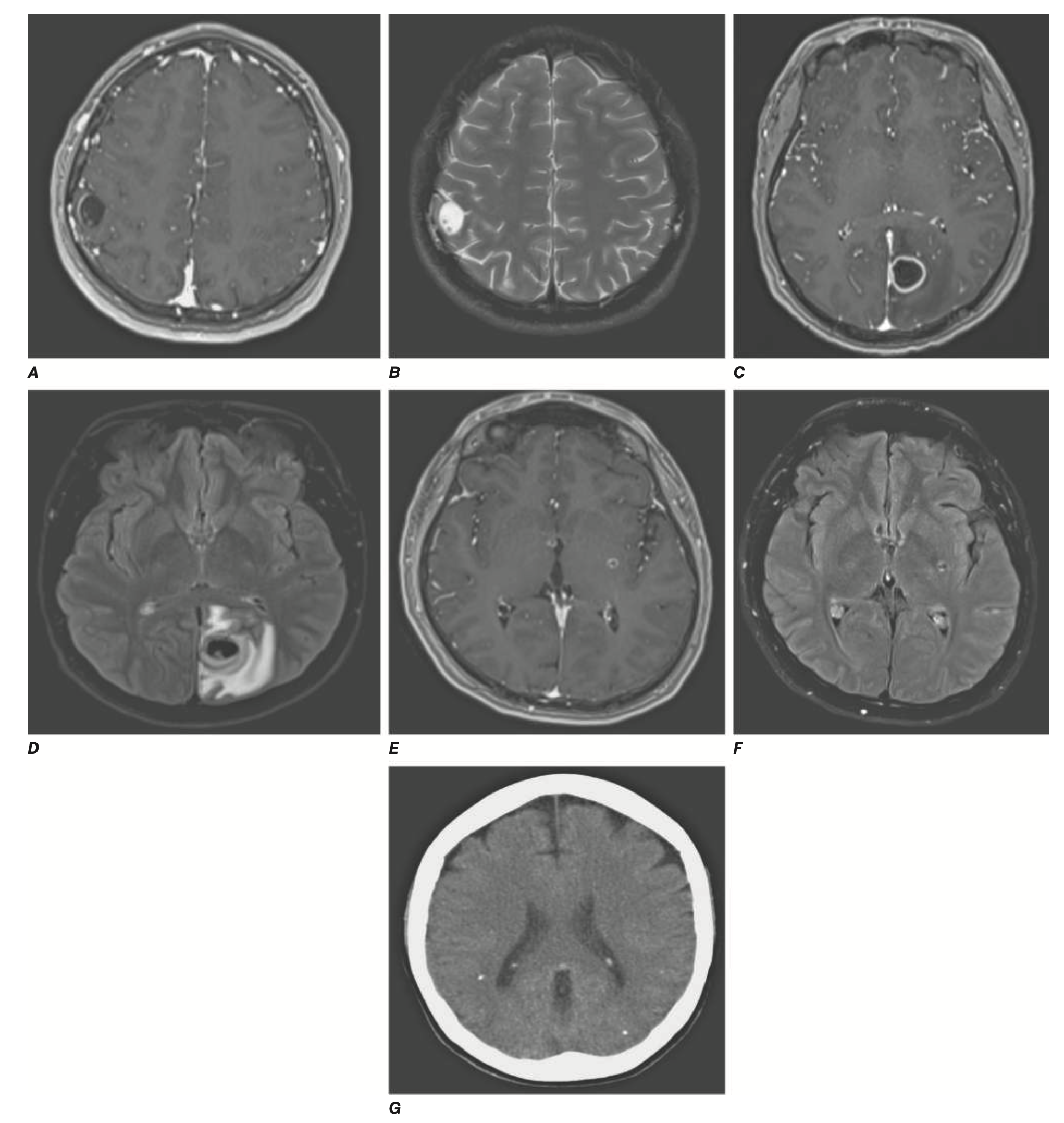 조영증강 뇌 영상(CT/MRI with CE): Cyst with scolex (Scolex가 있는 낭종), 다발성 석회화(Calcifications)