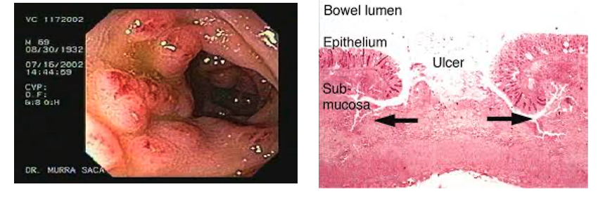 조직 침습: 영양형이 대장 점막 침범 → Flask-shaped ulcer 형성