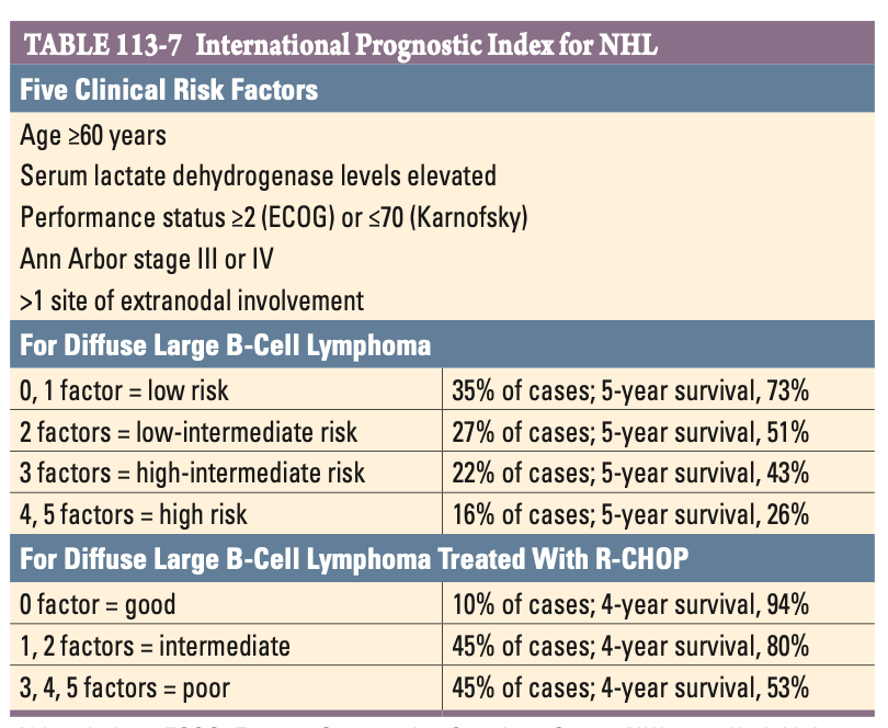 - 연령(>60), LDH(증가), 수행상태(≥2), 병기(III/IV), 림프절 외 침범(>1)