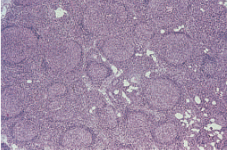 면역표현형: CD 19 +, CD 20 +, CD 10 +, BCL 6 + / BCL2 -