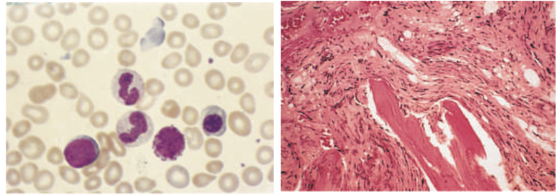 말초혈액: 누적적혈구 (Teardrop cells), 유핵적혈구, 좌방이동