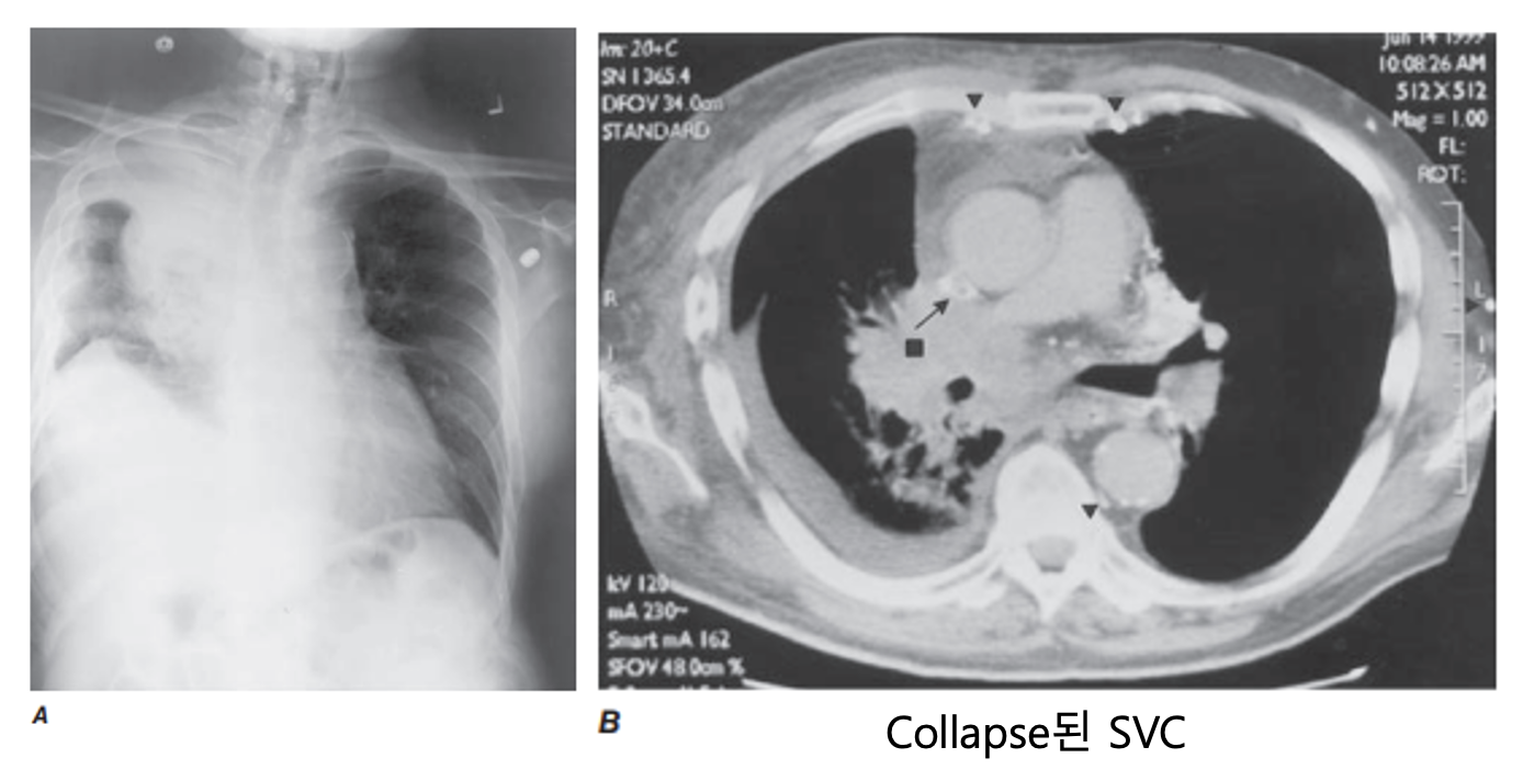원인: 우측 폐 상엽 종양에 의한 외부 압박 (80-90%)