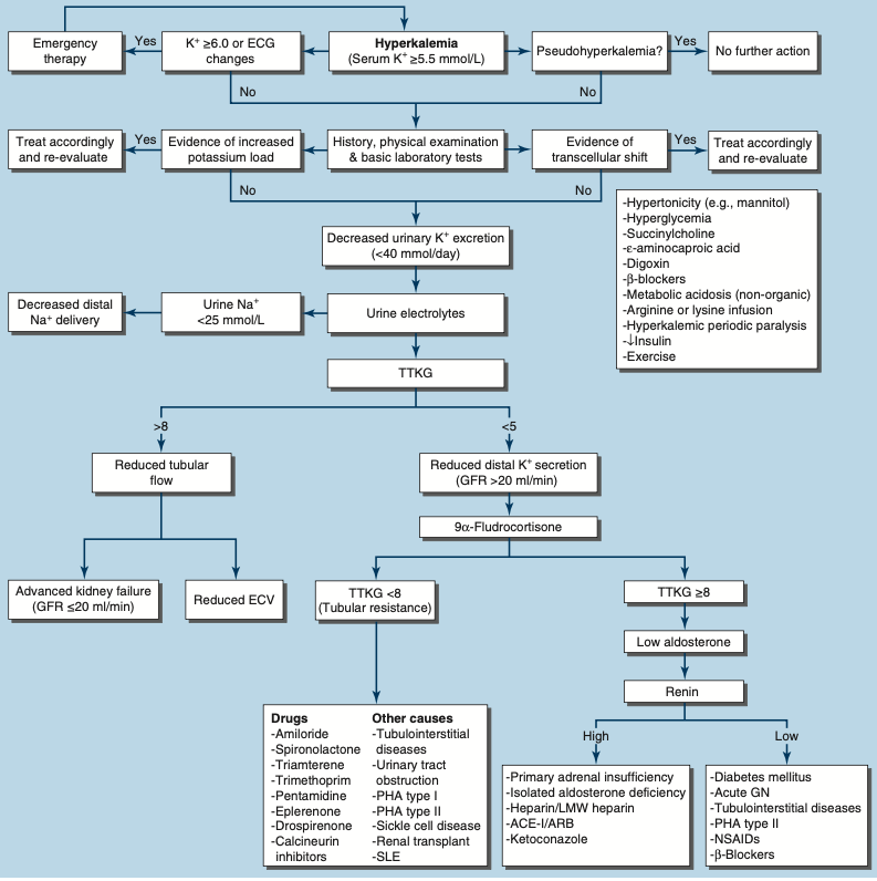 원인: 신부전, 저알도스테론혈증, 세포 외 칼륨 이동, 약물(NSAIDs, ACEi, ARB…) 등