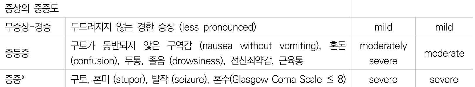 중등도 이상 증상: 고장성 식염수 투여 (3% hypertonic saline)