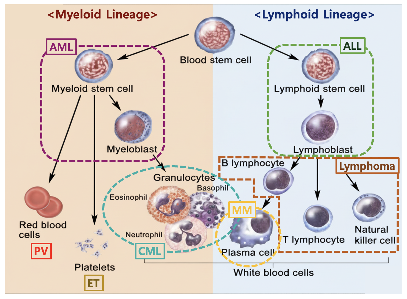 백혈병은 골수에 있는 조혈모세포의 악성 신생물로, 암세포의 분화가 멈추고 미성숙 단계에서 무한 증식하는 것이 특징이다.