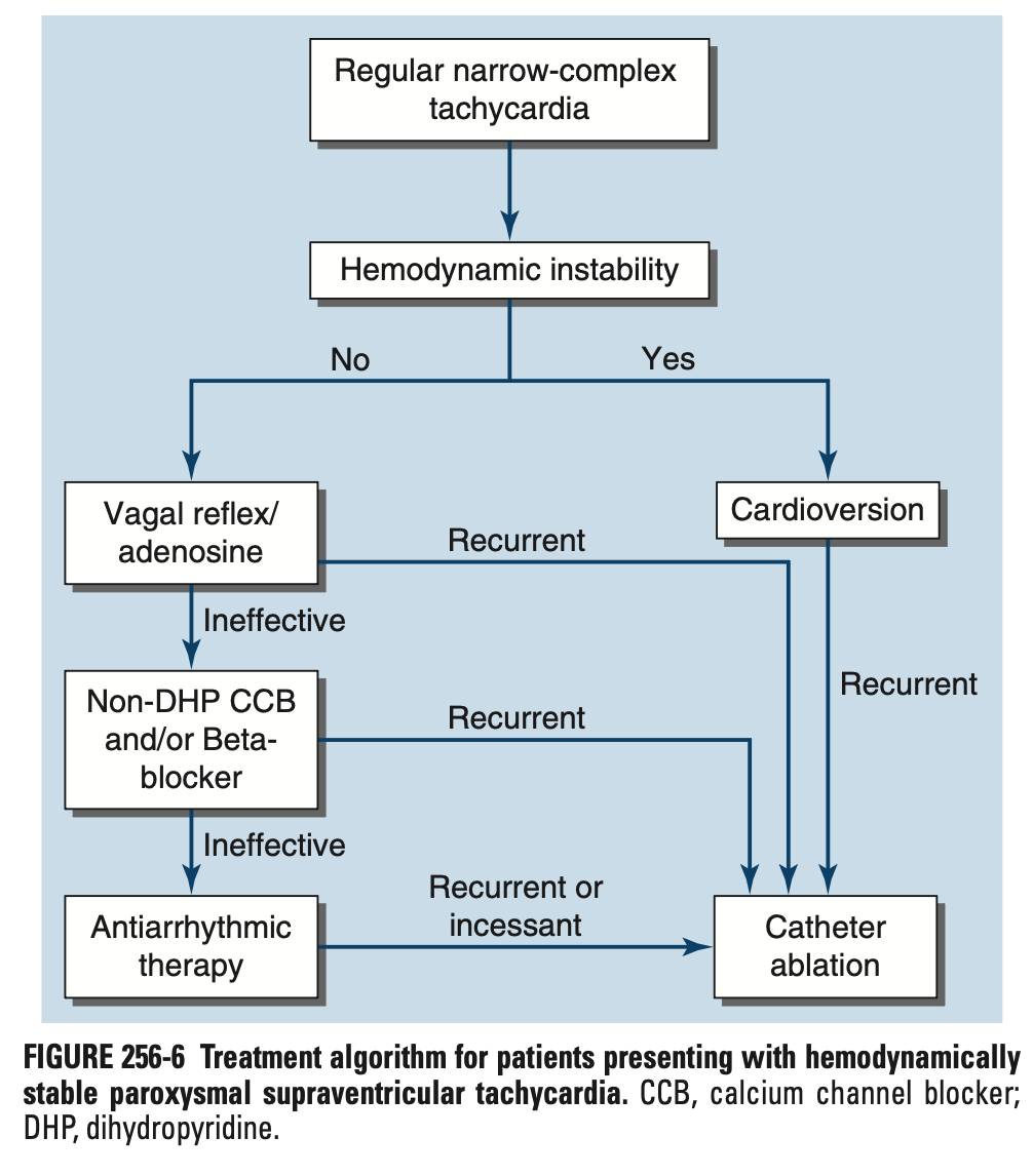 혈역학적으로 안정적이고 규칙적인 경우: Adenosine 시도 가능 (단, 감별 불확실하면 VT에 준해 치료)