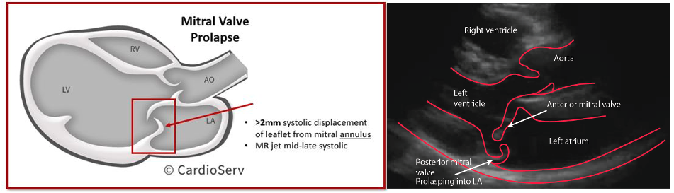 정의: 좌심실 수축기 동안 승모판막의 하나 또는 두 개의 엽(leaflet)이 좌심방 쪽으로 2mm 이상 전위(displacement)되는 질환