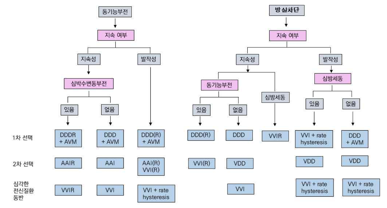 방실차단: 심방세동 동반시 VVI모드, 동반하지 않을 시 DDD모드 우선 선택