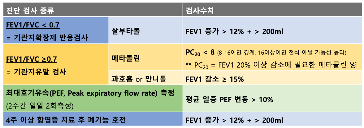 → 위의 방식들은 모두 5세 이상에서 사용할 수 있다. 5세 미만에서는 협조의 부족으로 폐기능 검사를 시행하기 어렵기 때문에 병력, 가족력, 보조적 검사, 약물치료에 대한 반응 등을 종합적으로 고려하여 임상적으로 진단한다.