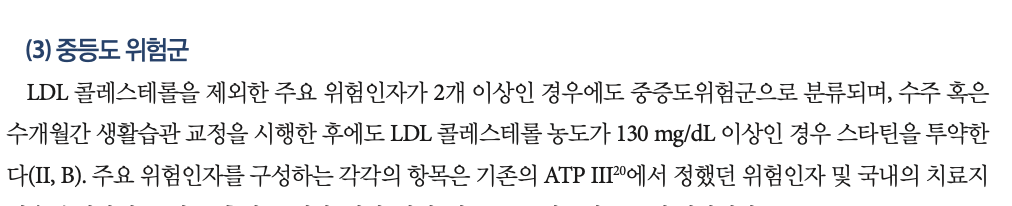 예를들면 관상동맥질환의 환자가 LDL 90이 나왔다면, 투약시작 시점인 LDL 50이상이므로 바로 투약을 시작한다.