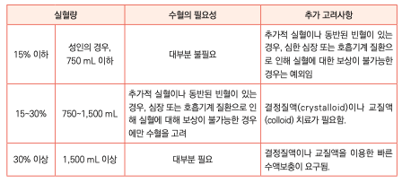 : hypovolemic shock의 초기처치와 더불어, 중증도 및 수액치료에 대한 반응에 따라 수혈이 필요하다.