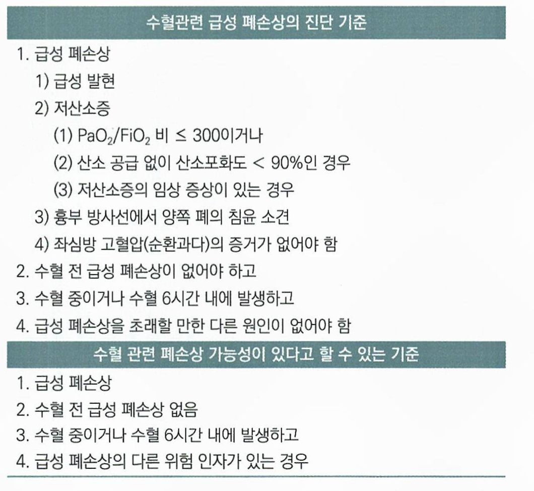 비심인성 폐부종 (Non-cardiogenic pulmonary edema): 좌심방 고혈압(순환과다)의 증거 없이 양측성 폐침윤 발생임상 양상 : 수혈 중 또는 수혈 후 6시간 이내 발생하는 급성 호흡곤란, 저산소증, 양측성 비심인성 폐부종