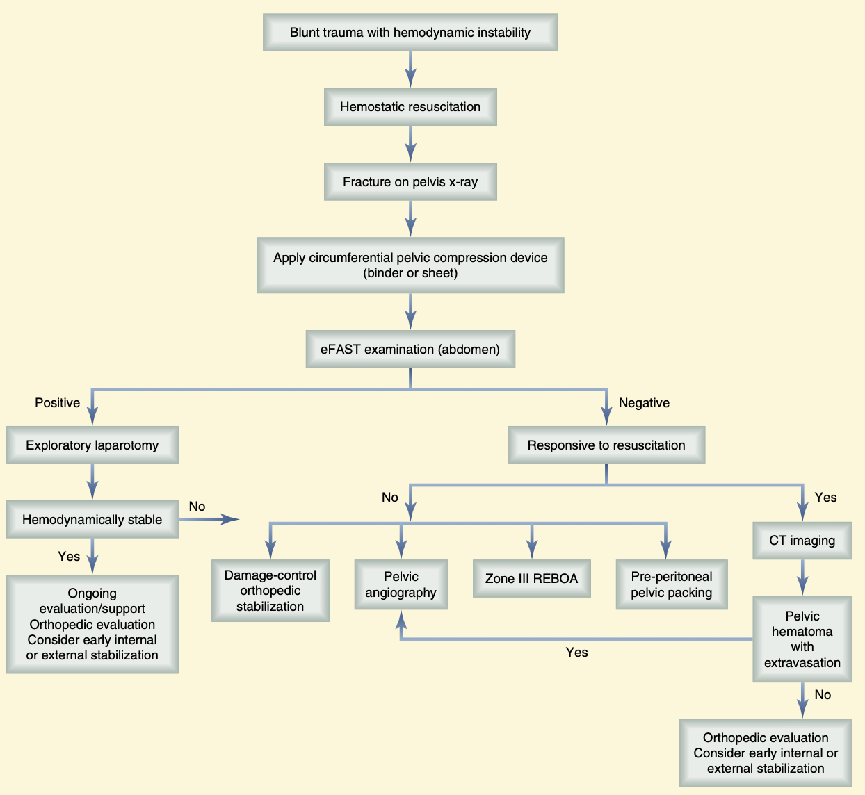 기타 고려 옵션: 복막전 골반 패킹, REBOA (Zone III), Damage control orthopedic stabilization