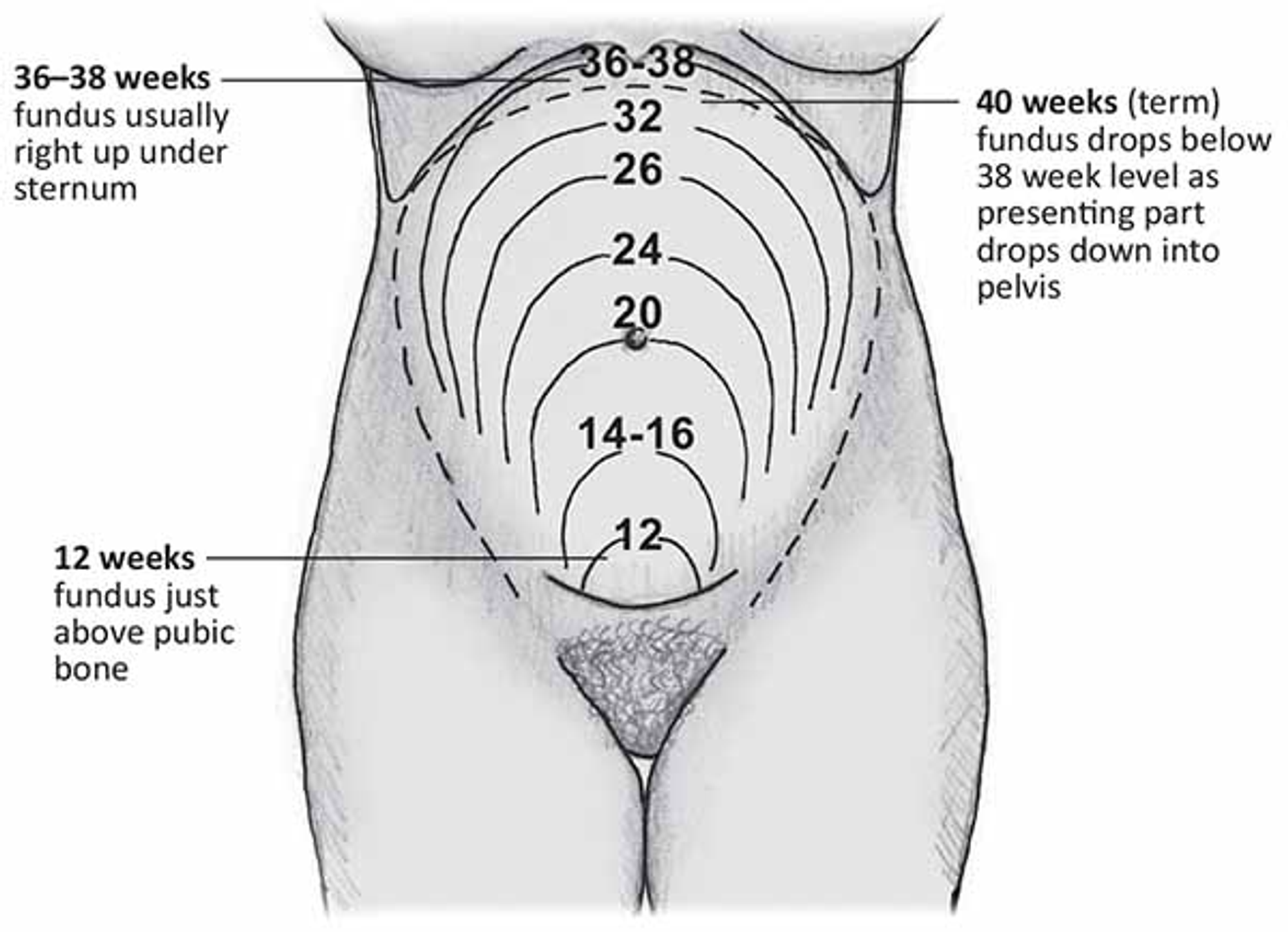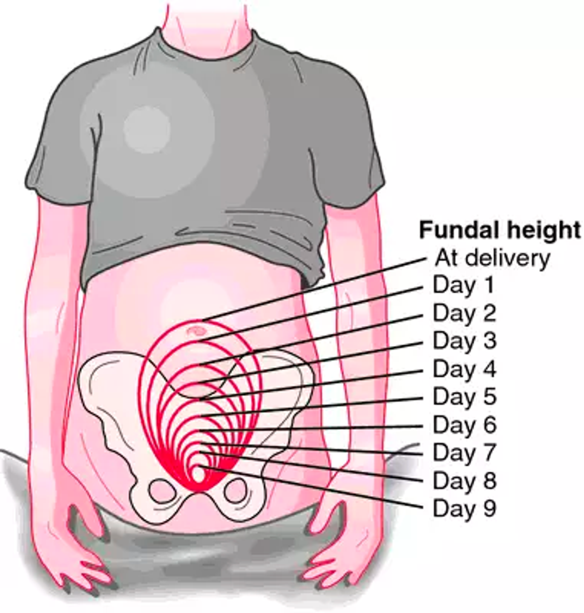 임신 20주차에는 배꼽, 만삭 때는 sternum까지 fundal height가 올라갑니다.[1] 분만 직후 배꼽까지 fundal height가 내려가고 involution되면서 1주일 후에는 치골 상부에서 촉진 가능, 2주 후에는 치골 상부에서도 촉진이 어렵게 됩니다.[3]