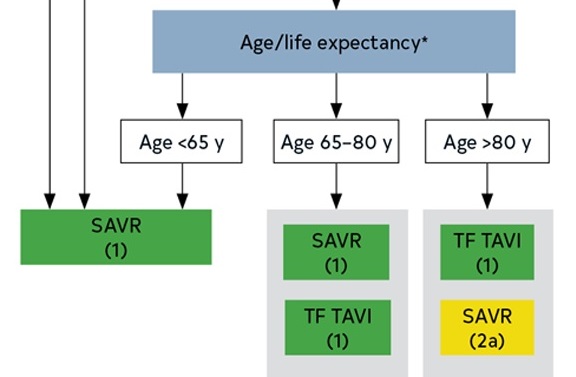 2020 ACC·AHA 가이드라인 중 판막 치환술을 처방받은 대동맥판막 협착증 환자의 SAVR와 TAVI 선택 기준으로 연령에 따라 ▲80세 초과는 대퇴부 TAVI 우선 권고 ▲65~80세는 대퇴부 TAVI와 SAVR 대등 권고 ▲65세 미만은 SAVR 권고하고 있습니다. (이는 과거와 달리 TAVI 시술이 수술 대비 대등하거나 우수한 효과와 안전성을 보이는 것을 입증되면서 권고사항이 변화되었습니다.)