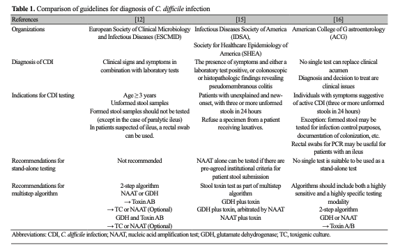 가이드라인마다 조금씩 다르기는 합니다. 미국 IDSA가이드라인에서는 GDH + toxin → NAAT 순서를, ACG 가이드라인에서는 GDH or NAAT → Toxin을, 유럽 가이드라인에서는 두가지 방식 모두를 인정하고 있습니다.